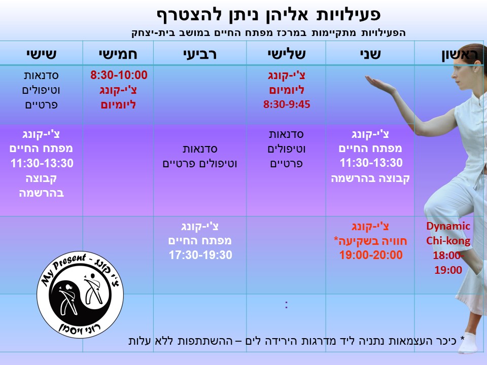 מזמינה אותך להתנסות בסדנא שתקנה לך כלים יומיומיים זמינים להתמודדות עם מתחים, באמצעות תרגילי צ’י-קונג פשוטים בעלי השפעה משמעותית.
